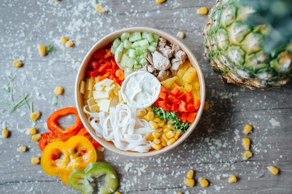 Hähnchenfilet, Reisnudeln, veganer Gouda; Gemüse: rote Paprika, Ananas, Gurke, Lauch, Brokkolisprossen; Gewürze: glutenfreie Sojasauce, Pfeffer, Himalayasalz; Sauce*.