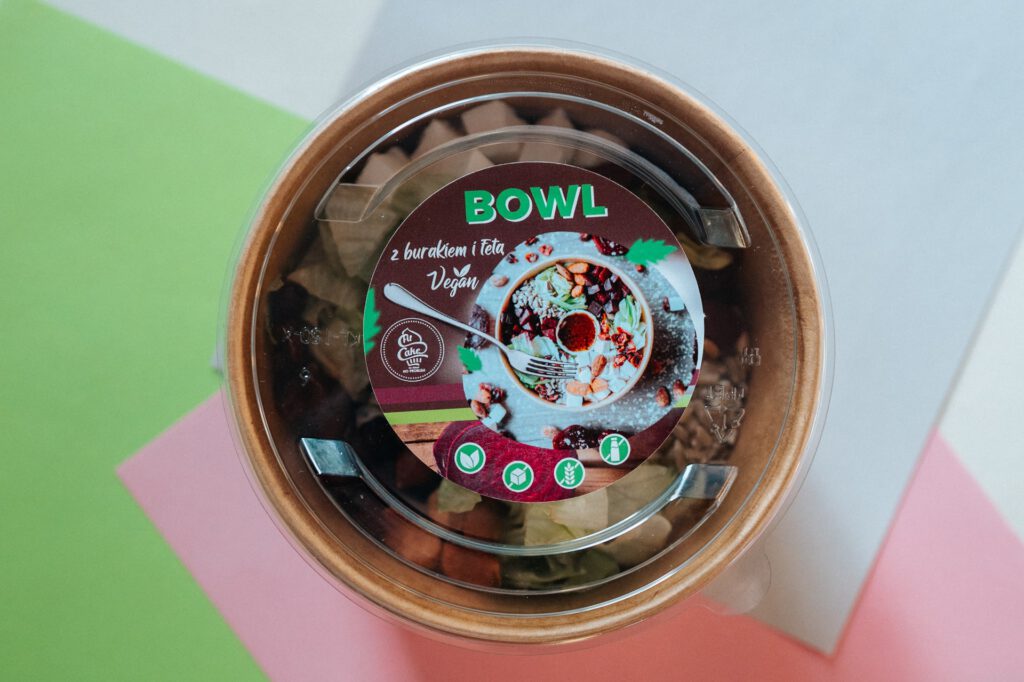 Rote Bete, veganer Feta*, getrocknete Cranberries, mit Kłodawa-Salz geröstete Mandeln, Sonnenblumenkerne, Sauce: Senf, Dattelsirup, Balsamico-Essig, Olivenöl.
