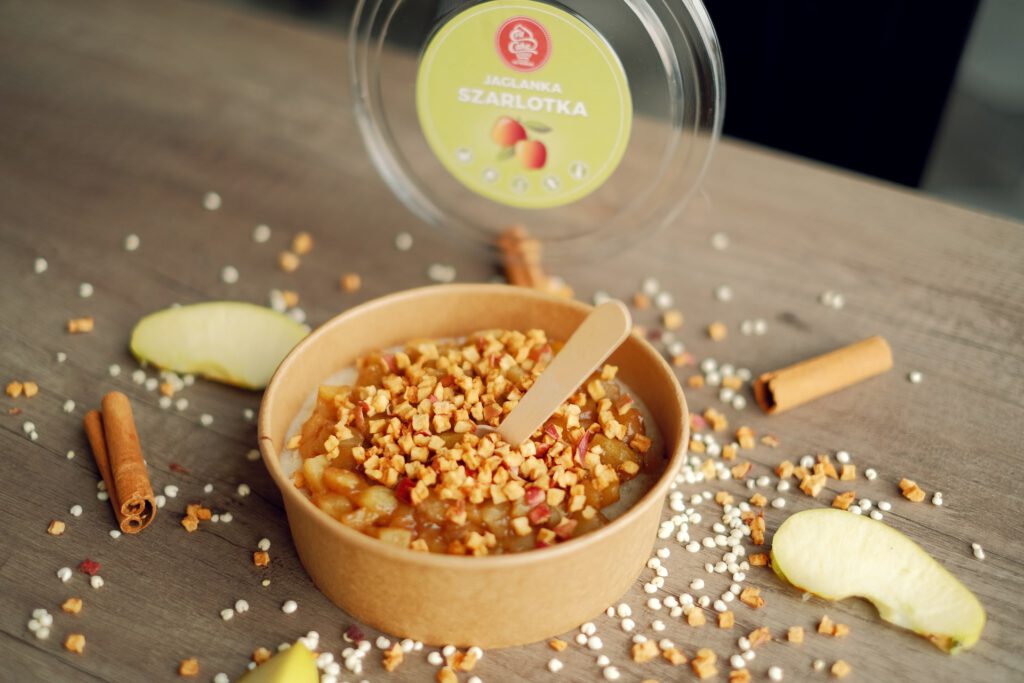 Buchweizen, Molkeneiweißkonzentrat, Äpfel, Kartoffelmehl, getrocknete Äpfel, Zimt, Erythrol, Agar, Himalayasalz.