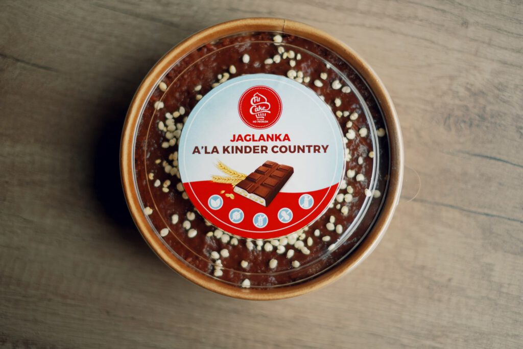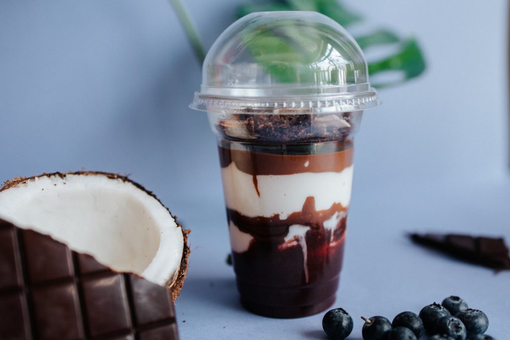 Schwarze Johannisbeere, Kokosnussjoghurt, Kokosnussmilch, dunkle Schokolade*, Fit Creme Schoko-Nuss vegan* (Fit Cake), Schoko-Granola* (Fit Cake), Süßstoff: Erythrol.