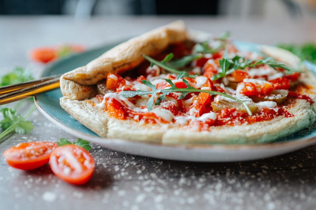 FIT CAKE* Keto-Brot; Pastrami (12%), veganer Gouda, Gemüse: Tomate, Kopfsalat, vegane Mayonnaise.