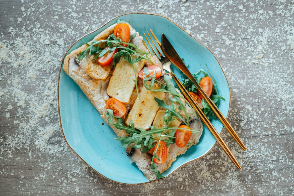 Maisstärke, Sojamilch, Rapsöl, Buchweizenmehl, Kartoffelmehl, Räuchertofu, Kirschtomaten, inaktive Hefeflocken, Himalayasalz, Kala Namak Salz, schwarzer Pfeffer.