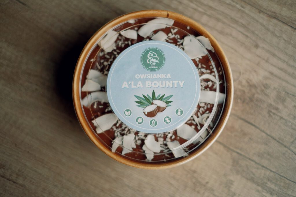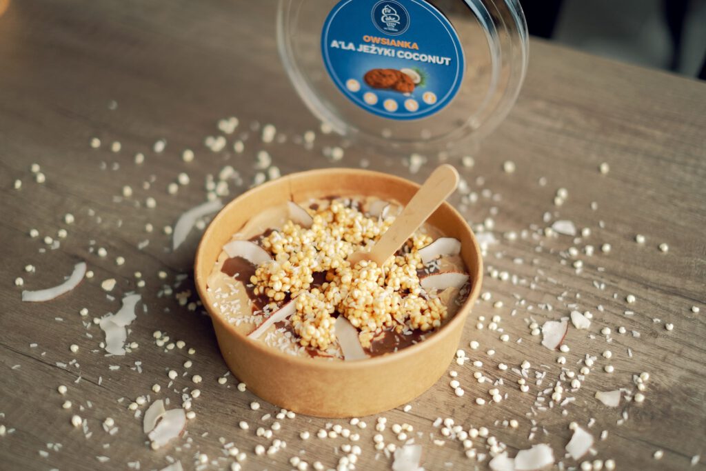 Kokosmilch, Haferflocken, Molkenproteinkonzentrat, Kokosraspeln, glutenfreier Pudding, Kakao, Johannisbrot, Dattelsirup, Erythrol, Agar, Himalayasalz.