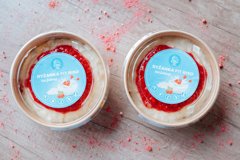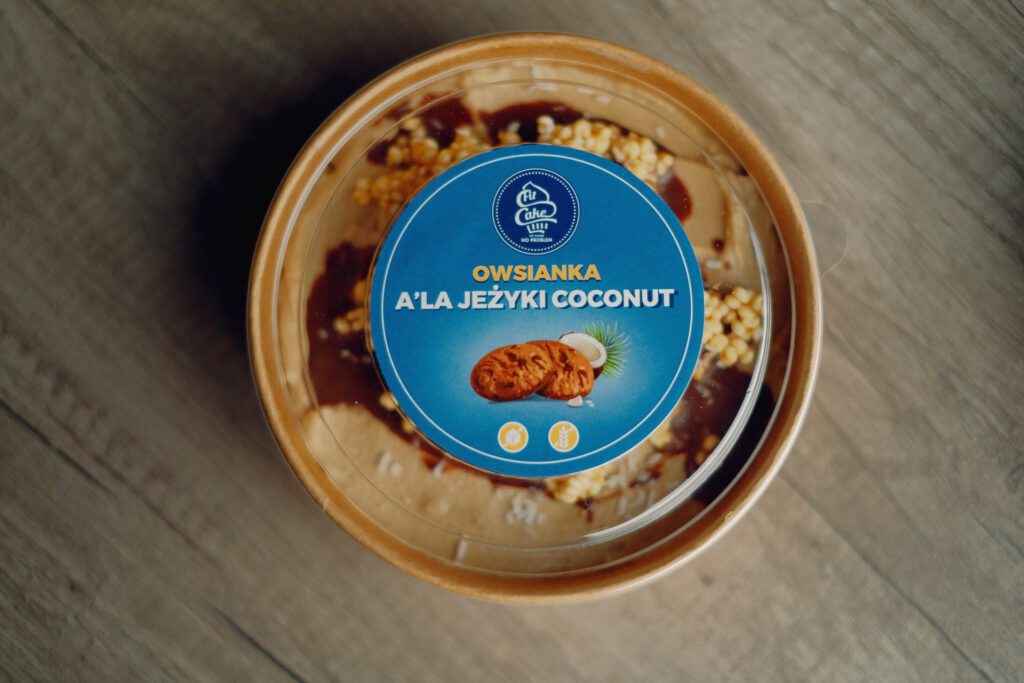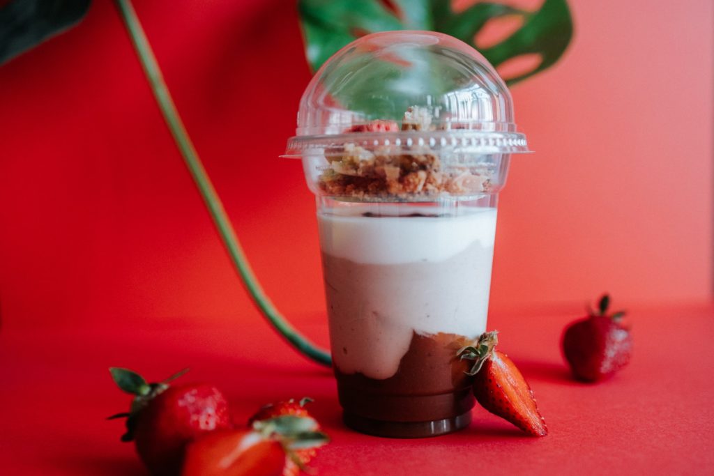 Erdbeeren, Kokosnussjoghurt, Kokosnussgranola* (Fit Cake), Süßstoff: Erythrol.