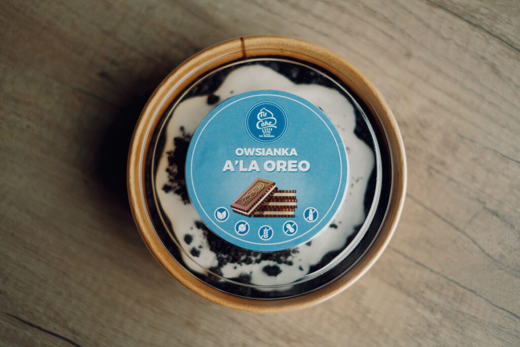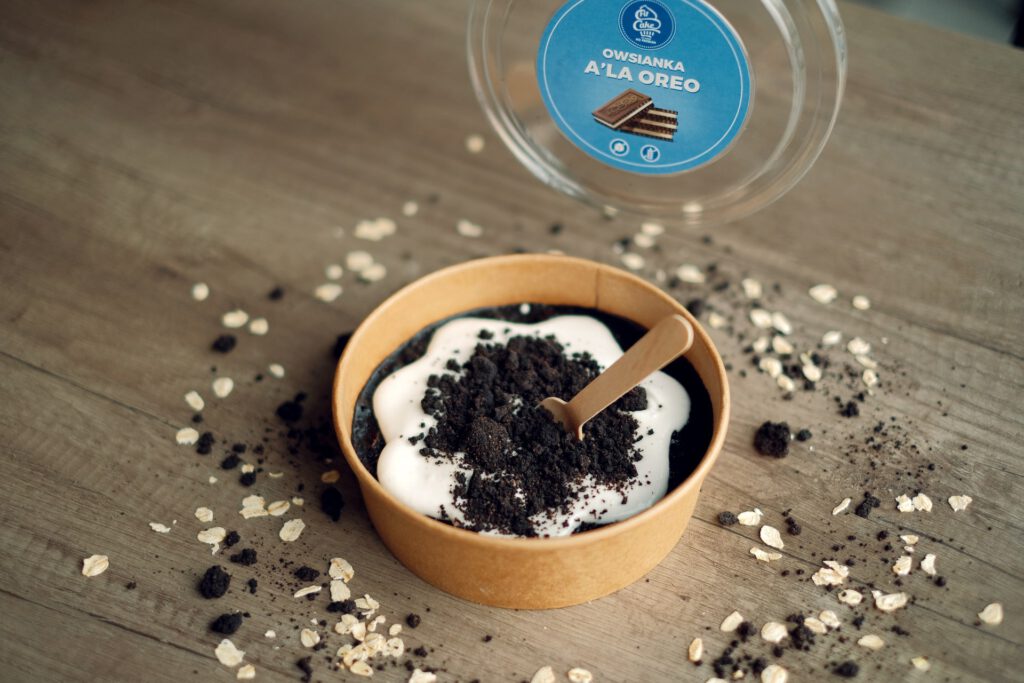 Haferflocken, Molkenproteinkonzentrat, Kokosmilch, schwarzer Kakao, zerstoßene Kekse*, Kakao, Johannisbrot, Erythrol, Agar, Himalayasalz.