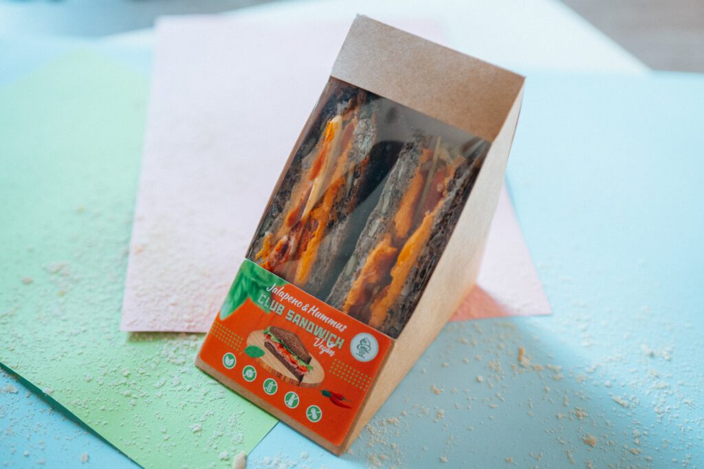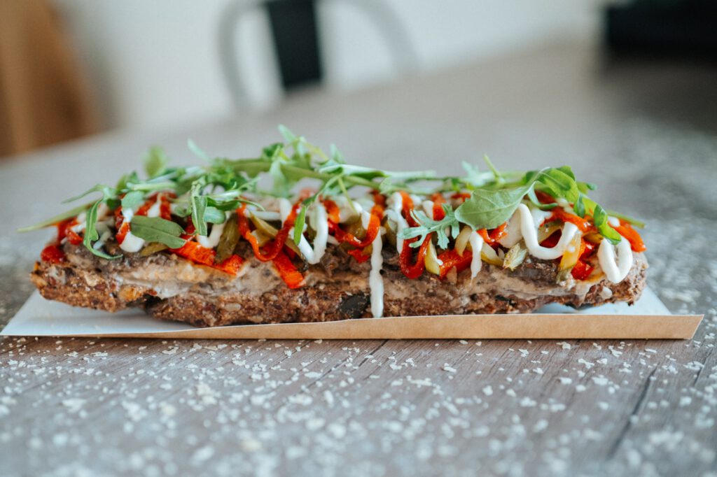 FIT CAKE Keto-Brot*; Paprika-Hummus**; veganer Gouda, Gemüse: Kopfsalat, Paprika, rote Zwiebeln; Jalapeno-Sauce***.