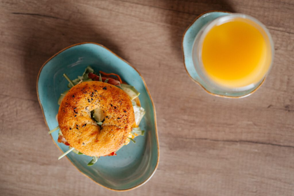 Paprika-Hummus, Zwiebel, Avocado, frisches Gemüse, vor Ort gebackener Bagel*.
