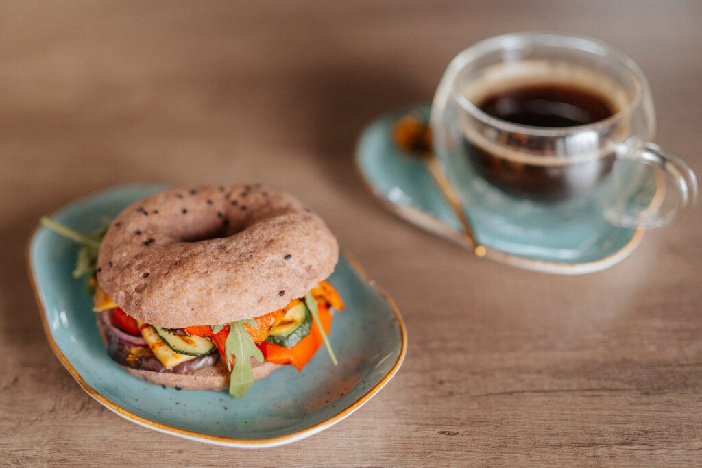 Gegrilltes Gemüse, geräucherter Tofu, Senf, Dattelsirup, Apfelessig, vor Ort gebackener Bagel*.
