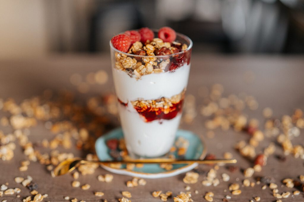 Erdbeeren, Joghurt mit erhöhtem Proteingehalt (Kuhmilcheiweiß), Kokosnussgranola* (Fit Cake), Süßstoff: Erythrol.