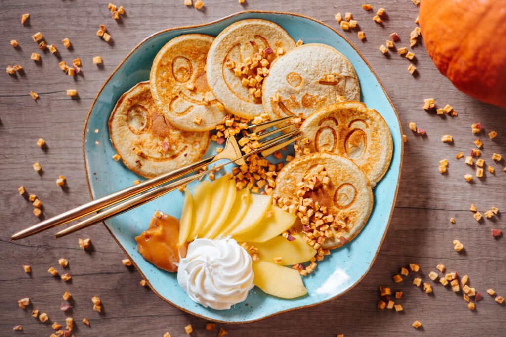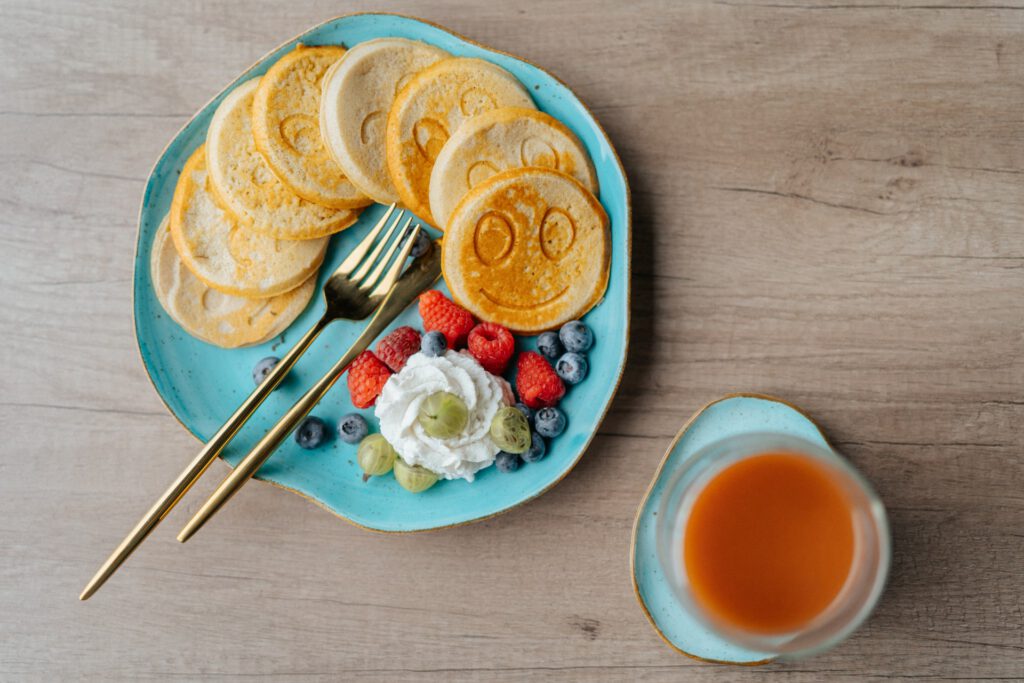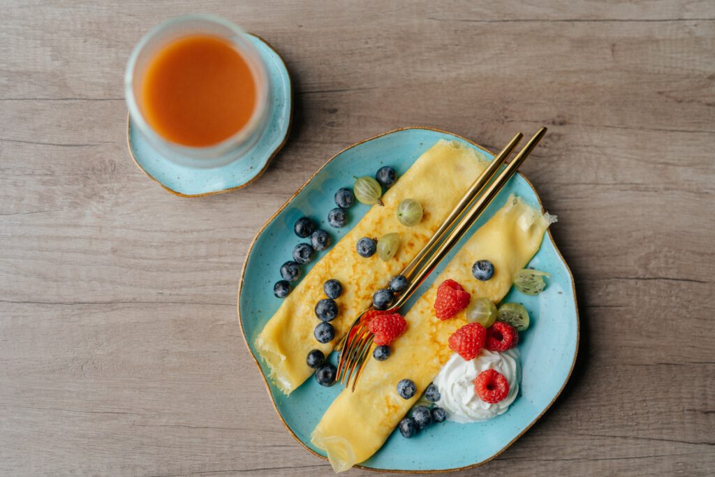 Eier, laktosefreie Milch, Buchweizenmehl, Kokosnussmehl, Kokosnussmilch, Früchte der Saison, Erythrol
