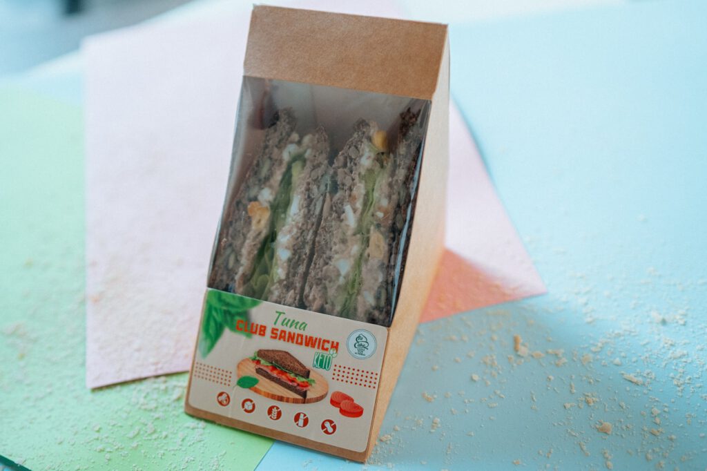 FIT CAKE* Keto-Brot, Thunfisch (32%), Eier, Senf, Kokosmilch, vegane Mayonnaise, Auberginenschalen, Gemüse: Salat, Mais, Gurke, Brokkoli-Sprossen. Gewürze: Pfeffer, Himalayasalz.