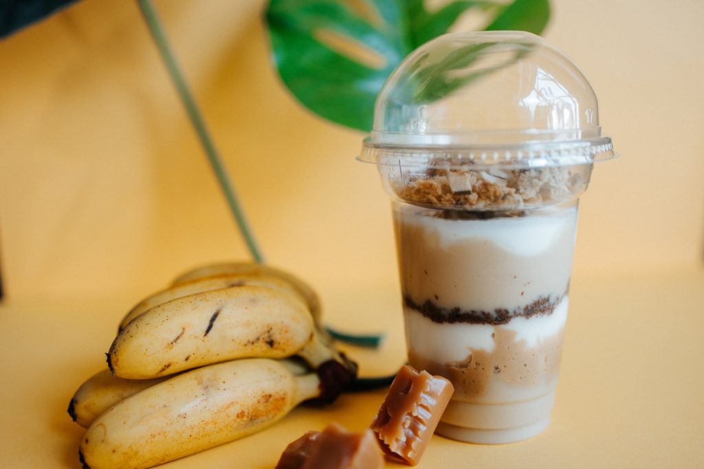 Banane, Kokosnussjoghurt, Erdnüsse, MandelmilchZartbitterschokolade*, Dattelsirup, Kokosnussgranulat* (Fit Cake), Himalayasalz, Süßstoff: Erythrol.