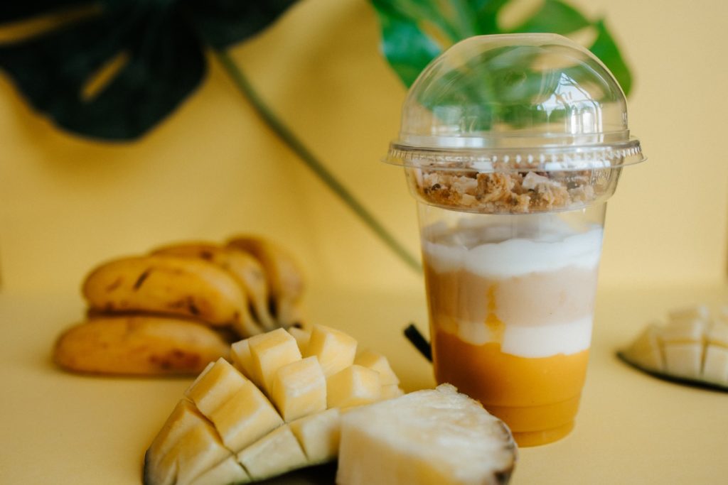 Mango, Passionsfrucht, Banane, Ananas, Kokosnussjoghurt, Kokosnussgranola* (Fit Cake), Süßstoff: Erythrol.